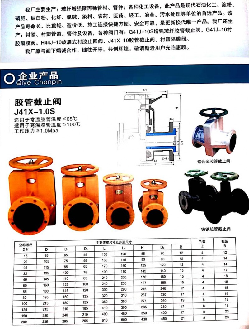 我廠主要生產:玻纖增強聚丙稀管材、管件;各種化工設備,此產品是現代石油化工、淀粉、磷肥、鈦白粉、化纖、氯堿、染料、農藥、醫藥、輕工、冶金、污水處理等單位的首選產品。該產品壽命長、比重輕、造價低、施工連接快捷方便、安全可靠,是更新換代唯一產品。我廠還生產:襯膠、襯塑管道、管件及設備,各種閥門有:G41J-10S增強玻纖膠管截止閥、G41J-10襯膠隔膜閥、H44J-10旋啟式襯膠止回閥、J41X-10膠管截止閥、襯塑隔膜閥。